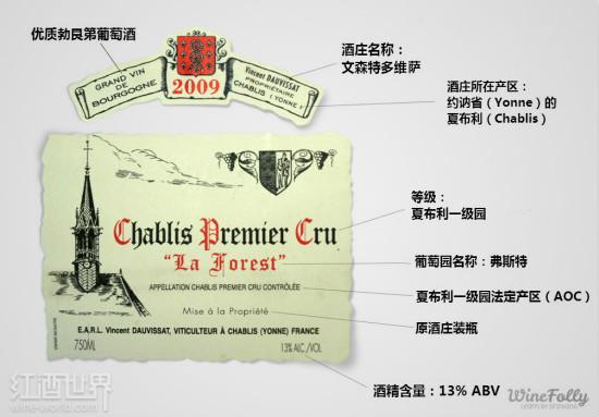 法國葡萄酒的酒標比較難讀懂。它的酒標上使用是法語,而且酒標上標出的是產區名,而非品種名。但是,我們可以根據產區來推斷這瓶酒的釀酒品種。假設酒標上出現的產區的是勃艮第夏布利(Chablis),可以推斷出這瓶白葡萄酒是由霞多麗(Chardonnay)釀制。因此,當你拿到一瓶法國葡萄酒的時候,除了酒莊,產區也是一條重要線索。