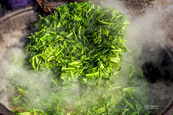 義工在做菜,他們都是當地村民。工作結束后,每人一碗熬菜、兩個饅頭、一盒煙,不要其他任何報酬。王子瑞/視覺中國