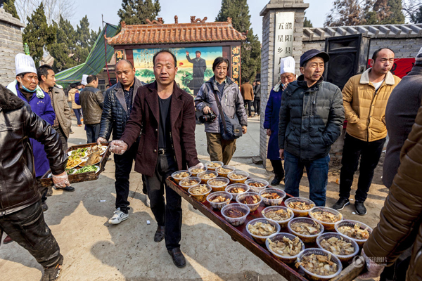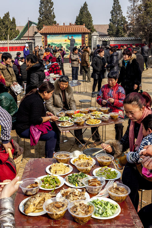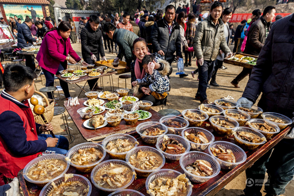 2016年2月25日,河南省濮陽縣五星鄉瑕丘村,方圓百里的2000余名群眾同吃“一鍋飯”,拜祭中華人文始祖舜帝。當日是農歷正月十八,相傳為舜帝的生日。每年的這天,無論天氣如何,當地方圓百里的人們都要云集五星鄉瑕丘。瑕丘廟會也因此而發展成為中原地帶傳統的各族群眾大集合、求和諧的民俗活動,千百年來久盛不衰。王子瑞/視覺中國