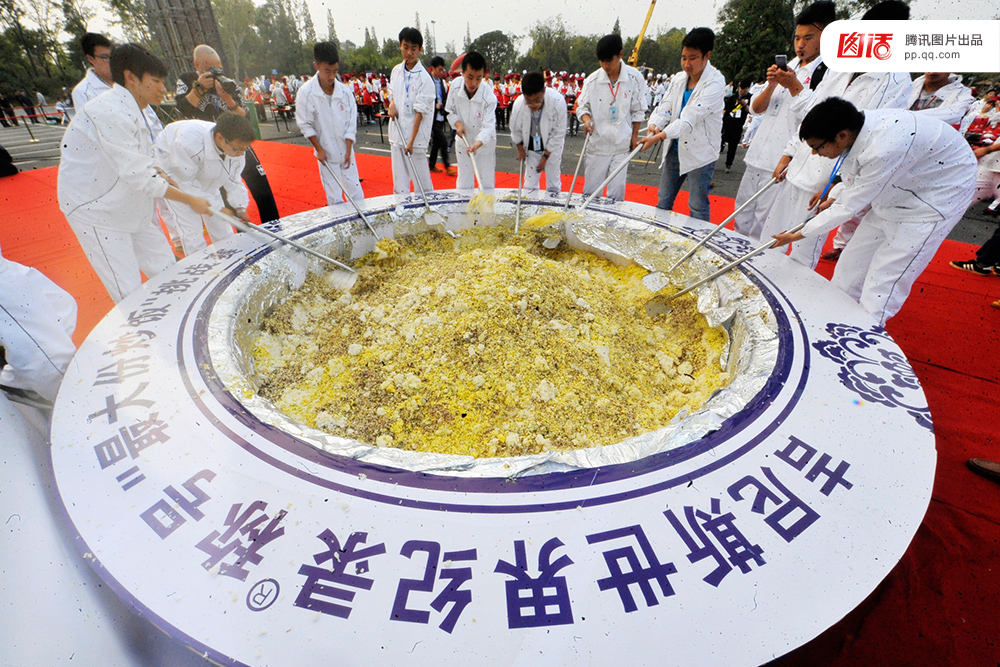 日前,揚州4192公斤重的“最大份炒飯”剛剛刷新吉尼斯世界紀錄,就被拉走喂豬,此舉在引發網友吐槽后,吉尼斯官方旋即宣布該紀錄無效,最后成了一個鬧劇。世界紀錄一度被人們賦予了挑戰極限、超越自我的精神內涵,其巨大的影響力吸引了很多商家將其當做炒作的平臺。近年來,一些“世界最大”的紀錄不斷涌現,這些刷數據式的紀錄本身技術含量很低,且缺乏實用性。而其背后則是靠量堆積與善后處理不當造成的浪費。圖為2014年4月26日,耗用3噸食材的世界最大份辣椒炒肉在長沙出鍋,民眾在雨中搶食。