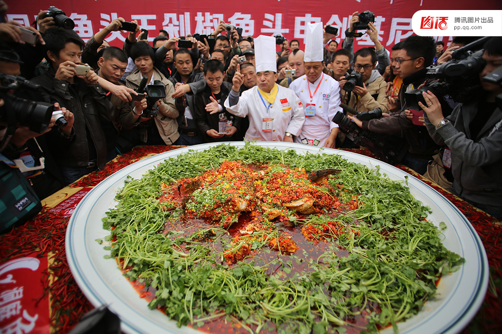 在美食上下功夫破紀錄是眾多地方政府部門和企業尤為中意的手段。圖為2013年10月19日上午,第23屆中國廚師節在長沙舉行。20名湘菜大師現場烹飪的“魚頭王”成功申報并創基尼斯紀錄。該頭約30歲的鳙魚王在張家界江埡水庫捕撈,魚長1.4米,體重102斤。