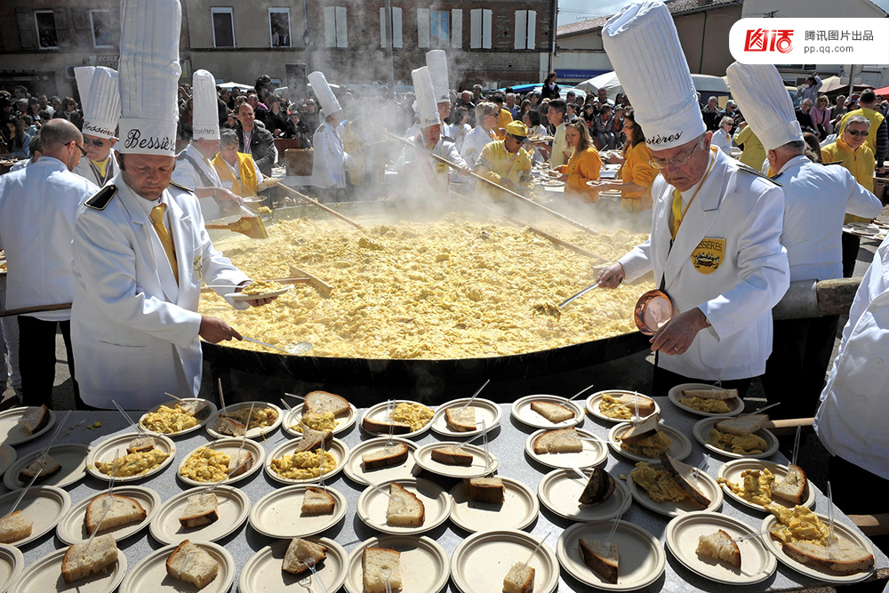 很多地方還都有著無聊的破紀錄傳統。圖為2014年4月21日,法國西南部小鎮Haux蒸制了世界最大煎蛋,總共耗費5214個雞蛋,20升油,50公斤熏肉,50公斤洋蔥和大蒜,2公斤鹽和2公斤胡椒粉。據悉,每年此時這里的民眾都會多添加一個雞蛋反復打破此項世界紀錄。