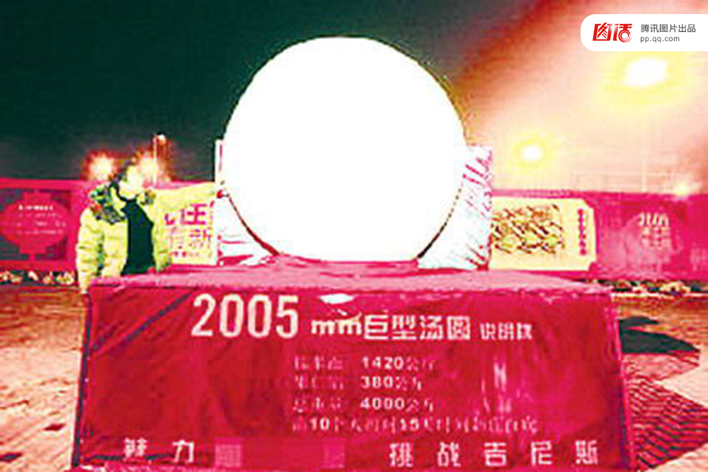 同樣是在沈陽,2005年2月20日,為迎接元宵節,街頭出現了一只重達4噸的大元宵。說明牌上寫道,這只元宵用去糯米1420千克,果仁餡380千克,由10位師傅歷時15天在露天制作而成。但這個大元宵沒有更大的鍋來煮熟它。而且,大元宵從制作到展覽都是在露天進行的,也沒人愿意再享用它,只能一棄了之。