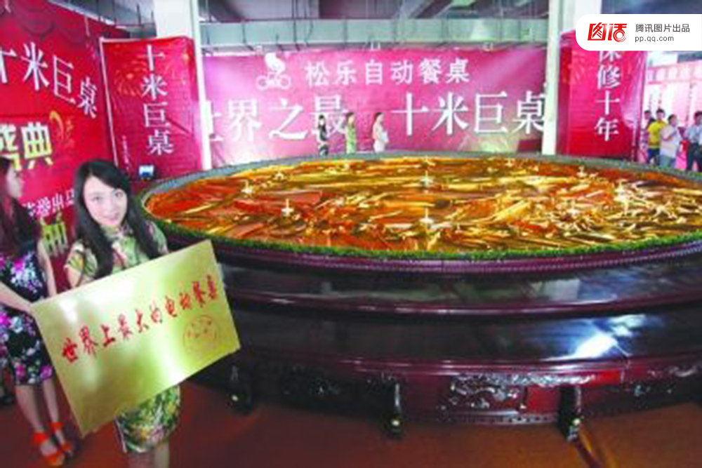 2013年6月,一張直徑10米、號稱“世界最大”的的電動餐桌亮相揚州一展覽。工作人員介紹稱,這張餐桌可承重6噸,同時供60人吃飯,實木打造,造價不菲。有網友質疑,這么大的桌子根本沒人會用。
