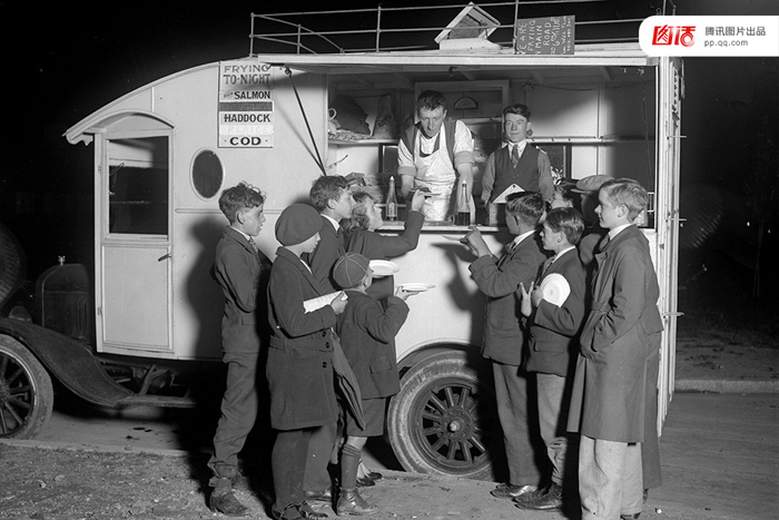 炸魚薯條是英國工業革命的副產品。盡管身為海島國家,18世紀以前,非沿海地帶的英國百姓其實很難吃到新鮮的魚。但19世紀誕生的蒸汽火車改變了一切,速度讓魚的價格便宜下來;而從南歐移民而來的猶太人,也帶來了炸魚和薯條的做法。炸魚薯條成了工人階層最受歡迎的廉價美食。圖為上世紀30年代,倫敦街頭的炸魚薯條店。