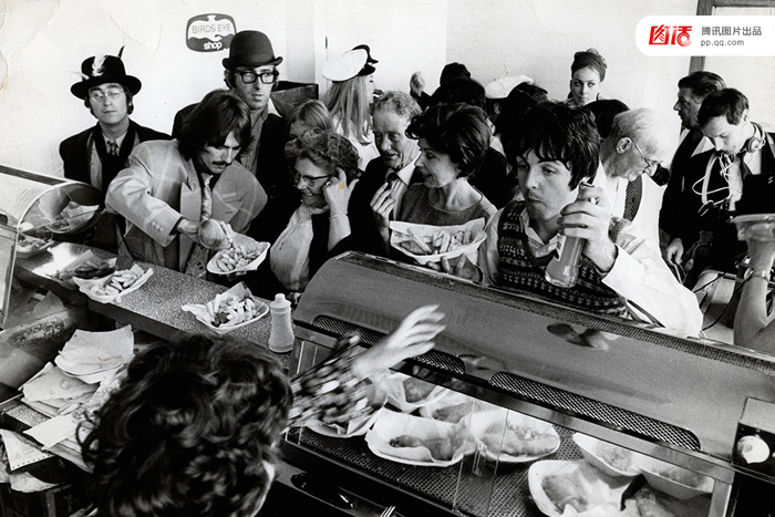 作為英國音樂史上最著名的搖滾樂隊,披頭士四個成員都很愛吃炸魚薯條。圖為1967年10月,披頭士樂隊成員在一家炸魚薯條店用餐。