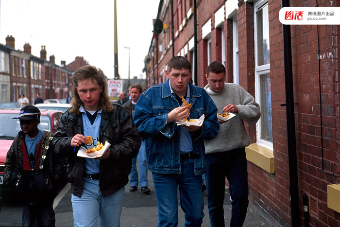 由于方便快捷,炸魚薯條成為英國任何戶外活動中賣得最好的食物。圖為1996年4月6日,英國曼徹斯特,球迷們吃著炸魚薯條前往觀看一場曼城VS曼聯的足球賽。