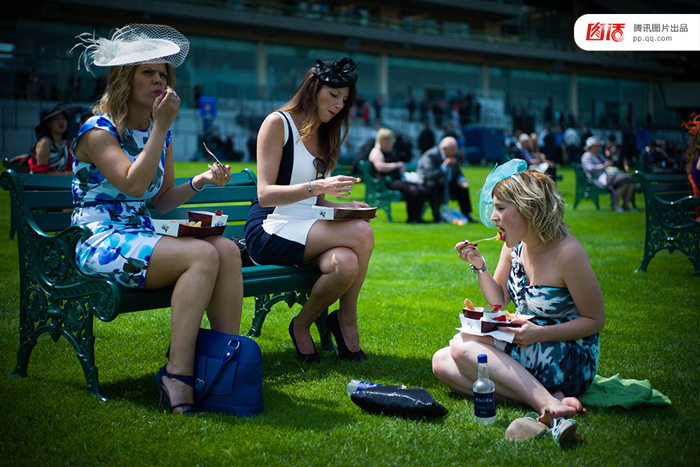 現在,每年英國人共消耗超過兩億五千萬份炸魚薯條。圖為2013年6月19日,參加英國皇家阿斯科特賽馬會的女士們坐在草地和長椅上吃炸魚薯條。