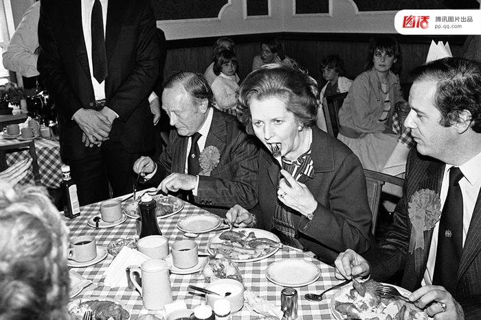據說,鐵娘子撒切爾夫人最喜愛的食物也是炸魚薯條。圖為1983年5月26日,時任英國首相撒切爾夫人為競選連任首相而奔波,到訪倫敦約克郡時午飯吃的就是炸魚薯條。