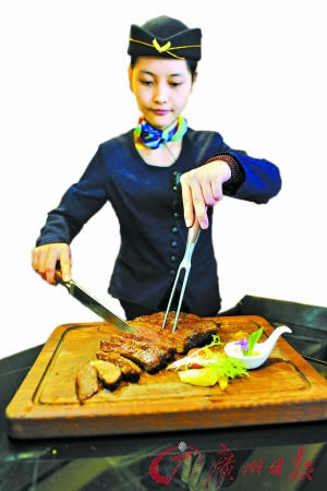 食客一走進餐廳,穿著空乘制服的服務人員便會像登機時一樣引導你入席落座。在空姐的幫助下慢慢享受一份果木牛扒,仿佛是一種別致的“旅行體驗”。