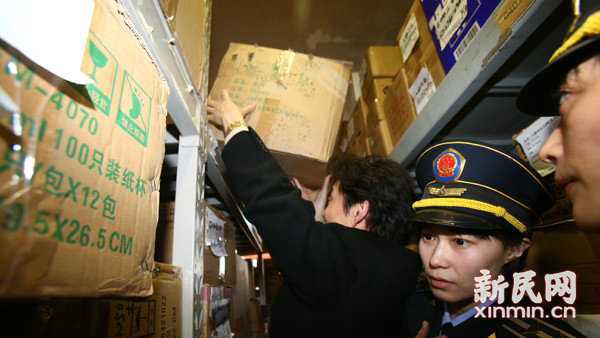 圖說:執法人員對超市倉庫內的一次性塑料杯進行了查驗。新民晚報新民網 蕭君瑋 攝