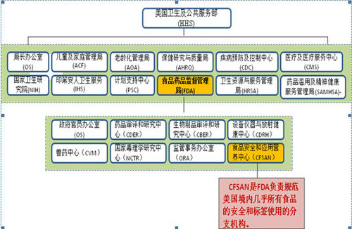 FDA實行多部門相結合的食品工業一體化管理模式。美國聯邦政府有十多個部門負責食品安全工作。其中,負責保障食品安全和消費者利益的聯邦機構主要有:衛生和公共服務部(DHHS)下的食品和藥品管理局(FDA),美國農業部(USDA)所屬的食品安全檢驗局(FSIS)和動植物衛檢疫局(APHIS)以及環境保護局(EPA)。這些部門主要按食品類別進行分工監管,并與各州地政府一起形成美國的食品安全監管體系。