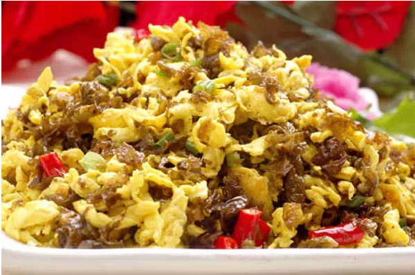 煎餅卷的菜,以頭臺鄉產的小魚小蝦為上品,用螺絲辣子一炒,嚼得有勁,辣得過癮。