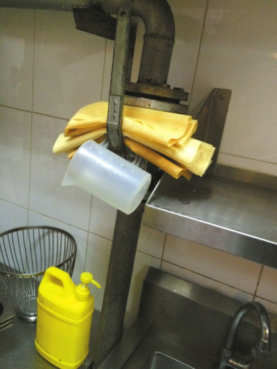 3月28日下午,該店一名老員工教記者清洗水槽和濾水箱等程序,并要求這項工作每天下班前都要進行。隨后,該店員工掀開下水道水槽上面的不銹鋼蓋子,順手拿起一塊抹布擦拭。不銹鋼下水槽有1米多長、30厘米寬左右,蓋子上面沾滿了灰塵和臟物,臟水都流到了旁邊水池未來得及清洗的盛菜用餐盒上。