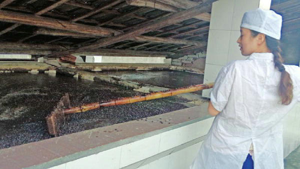 程熊釀造廠的工人在翻曬醬醅