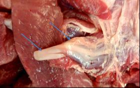 同時,為了進一步弄清此問題,佘銳萍教授專門到某超市豬肉銷售柜臺去尋找到了類似網上的白色帶狀物(見下圖1),此物用手拉的時候可變長,放開 后,它可漸漸縮回變短。用刀切開此白色帶狀物后部表面的肌肉后,展現在眼前的是一塊肌肉結構(圖2),而白色帶狀物正是這塊肌肉的肌腱結構,并不是寄生 蟲。進一步翻開后發現,這塊肉是從豬蹄部分割下來的一塊肌肉。