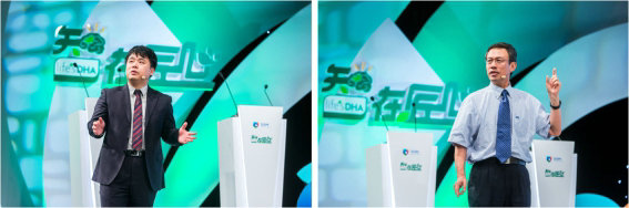 (帝斯曼人類營養與健康業務部的科學家在路演環節公布科學研究數據,以及宣布即將推出的定制化高濃度Omega-3的解決方案。圖左:賀慶博士,圖右:張衛國博士)