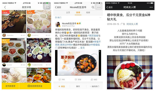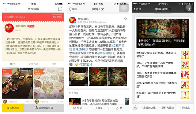在中國的文化中,幸福是可以被延續以及傳承的,同樣,在中糧福臨門的“!蔽幕,“幸福時刻”也通過此次活動進行了延續。中糧福臨門在此次秒拍的懸賞令活動中,延續以往的活動形式,號召網友曬出中秋團圓飯視頻,將中秋與美食為伴、與家人團聚的幸福,分享出來,將品牌內涵與活動主題進行結合,加強了傳播的“親和度”。同時,除秒拍平臺外,考慮到現在社交習慣的轉變,此次中秋活動在微博、微信平臺也同步展開,精準、迅速地將活動內容傳遞給消費者,通過自媒體力量進行擴散。