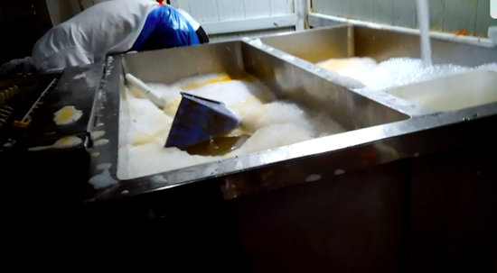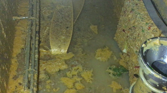 記者想更深入地觀察洗碗機內部,于2017年6月18日早7點打開了洗碗機的機箱蓋,可以看到傳送帶一側沾滿了油漬,并散發出陣陣腐爛的惡臭。洗碗機內壁上沾滿了油漬和腐爛的食物殘渣,洗碗機內的蓄水池滿是黃色的污水。記者把洗碗機蓄水池里的水排凈后發現,蓄水池內壁上沾滿了的油脂,用手可以刮下厚厚的一層。蓄水池內還可以清晰的看到一些掉落的碗盤,上面早已沾滿了油脂。
