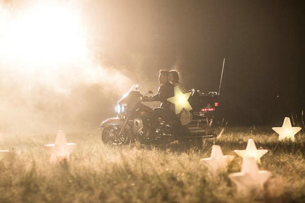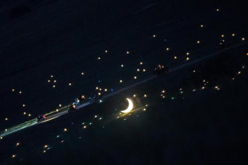 晚上7點左右,太陽隱入地平線,廣袤的草原被夜色籠罩。上千顆散落在地上的“星星”和“月亮”一齊亮起。草原秒變“星空”,遠遠看去,仿佛夜空倒影在大地上。一群草原漢子跨上哈雷,騎上駿馬,載著星星燈,聲勢浩蕩地穿過星星月亮裝置,像流星飛速劃過大地,一場前所未見的草原流星雨就在眼前下了起來。