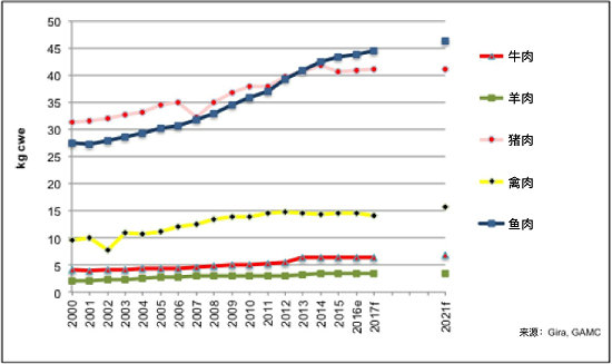 在所有的肉類食材中,豬肉作為眾多菜肴的主要原材料無疑是最受消費者歡迎的肉類食材之一。根據下面兩張圖可以看出,2005年~2017年間,豬肉占總肉類消耗量的比重一直保持在百分之六十以上,是最受消費者歡迎的肉類食材之一。