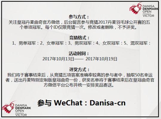 當然,除了選手之外,此次丹麥公開賽還有一個讓人眼前一亮的變化,那就是丹麥本土品牌Danisa皇冠丹麥曲奇接替原本的羽壇老大哥尤尼克斯(Yonex)成為了2017丹麥羽毛球公開賽的主冠名商。據悉,今年丹麥羽毛球公開賽冠名商的“比拼”可謂相當激烈,在經過國際羽聯和丹麥羽協的多輪談判、比拼之后,最終還是Danisa皇冠丹麥曲奇從眾多候選者中脫引而出,笑到了最后。此前皇冠曲奇曾成功贊助了2015、2016兩屆丹麥羽毛球公開賽,本屆更是將老大哥尤尼克斯拉下馬,首度成為丹麥羽毛球公開賽的總冠名商,這也是該項賽事歷史上罕見的以本土知名品牌為總冠名商的案例。