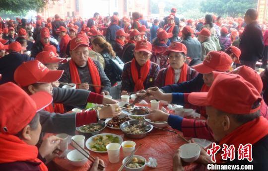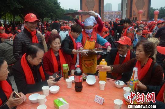28日,來自四川成都、自貢、宜賓、內江、眉山等地60歲以上的3600余名老人,齊聚眉山市彭山區“中國長壽城”牌坊下共享360余桌“長壽壩壩宴”,歡度重陽節。