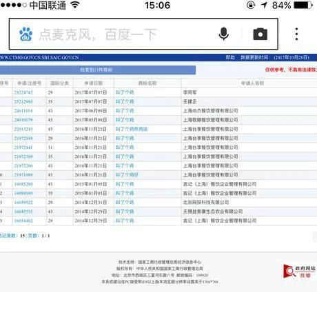 記者隨后通過國家工商總局商標局“中國商標網”進行綜合查詢后得知,“叫了個雞”共有15個注冊號(其中還包括“叫了個雞炸雞店”和“叫了個雞仔”),主要由上海臺享餐飲管理有限公司、言記(上海)餐飲企業管理有限公司、上海尚杰餐飲管理有限公司、上海歌娜餐飲管理有限公司、北京網探科技有限公司、無錫益家康生態農業有限公司等注冊。