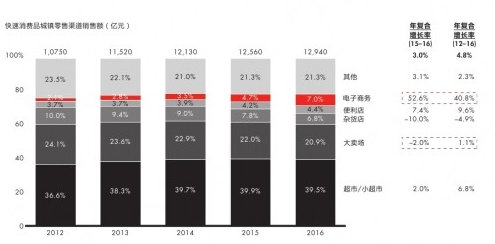 早在2012年,大型商超的市場占有量開始放緩,這種情況在2016年達到巔峰,大賣場和大超市的快消品零售額出現了負增長,而增長勢頭最強勁的要數風頭正盛的電商渠道和貌不驚人的便利店兩大行業。電商的五年復合增長率甚至高達40.8%,便利店雖增長勢頭緩慢,但也是穩扎穩打,步步為營,五年復合增長率為9.6%。