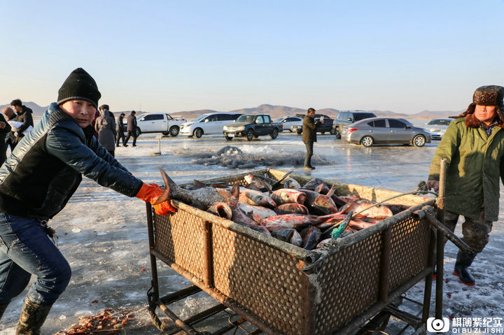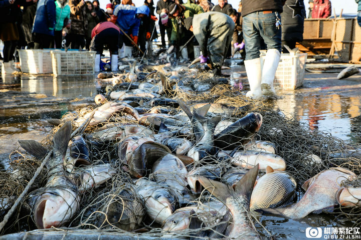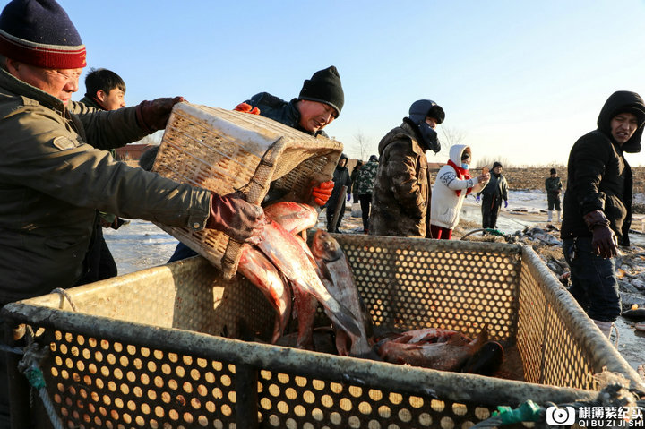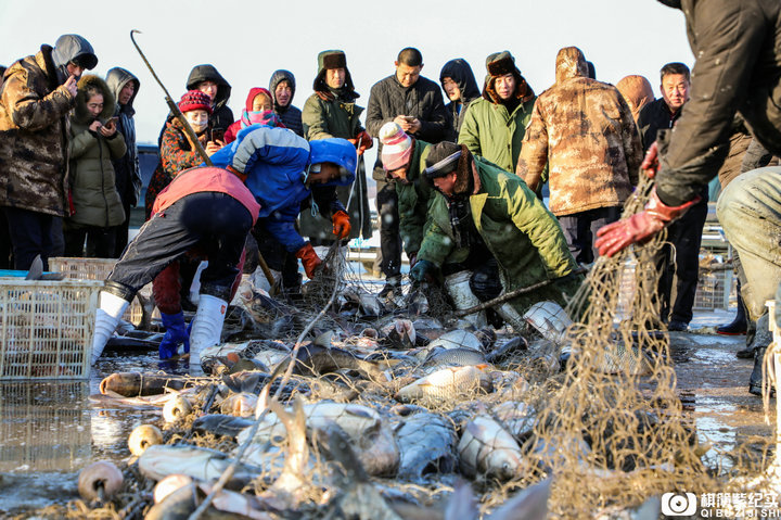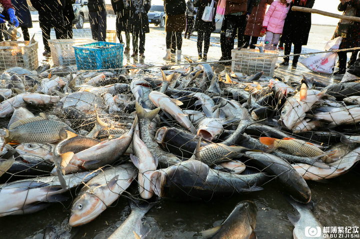 魚越上越多,冬捕人干脆趟著魚陣搶運鮮魚,保證送到運魚車的時候魚不被凍僵,否則賣價會打折。明天就是小年了,在這里祝福網友連年有余平安如意。(棋簿紫/圖文)