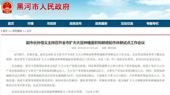 據公開信息顯示,黑龍江省黑河市的大豆種植面積約占全國大豆總面積的六分之一,是全國大豆種植面積最大、總產量最高的地級市。據黑河新聞網報道,黑河市在4月30日召開了全市擴大大豆種植面積和耕地輪作休耕試點工作會議,傳達國家和省專題會議精神,落實省里下達黑河市擴大大豆種植面積和耕地輪作休耕試點工作任務。