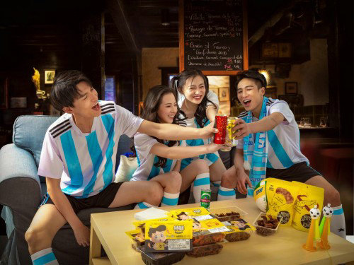 這組手繪風的場景化海報一經上線,就引起無數吃貨和球迷們的點贊評論。海報分別以家庭、大學宿舍、酒吧的場景為背景,描繪出不同背景下的各色人群看球的場景,人物們表情各異并且極富張力,再搭配旨在引起共鳴的走心文案,讓消費者獲得強烈的共鳴和代入感。