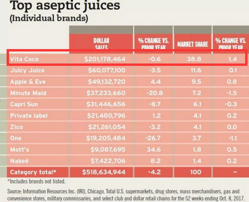 但是在高糖果汁銷量顯著下降的同時,高端果汁市場卻迎來了春天,尤其是通過“原汁”、冷榨活高壓HPP處理的果汁,比如椰子水這類NFC果汁。據歐睿國際報告顯示,椰子水等高端果汁因其天然健康的市場定位發展迅速,與其他植物水的銷售總額相比已從2.17億美元上升至8.89億美元。IRI統計數據也能看出,0脂肪0 膽固醇的唯他可可椰子水甚至取得了美國市場無菌果汁銷量榜首的成績。