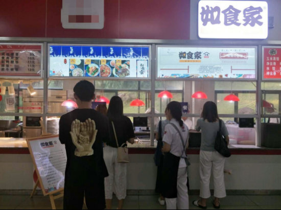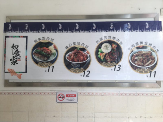 如今,在餐飲這條道路上,劉女士已經越走越順暢。在經營如食家的過程中,她進行了改良,加入了土豆絲、海帶絲、辣白菜等配菜,還有例湯,做成了套餐的形式。與其他頗為“低調”的檔口不同,只要有機會,她就在餐廳任何可以做營銷的地方放上營銷物料,讓來來往往的學生一眼就能看到自己的產品!八麄円惶觳怀,兩天不吃,只要我的產品在他們的視線之內,總有一天會想嘗嘗的!”