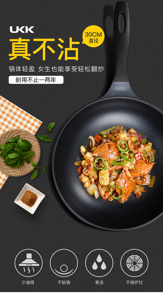 德國UKK炒鍋,鍋底聚能設計能讓鍋受熱更均勻,減少營養流失的同時,為用戶減少95%的油煙,仿生荷葉不粘鍋的設計,讓烹飪實現自離式不沾,高溫翻炒不焦不糊。為用戶提供優雅便捷、健康時尚的烹飪體驗。