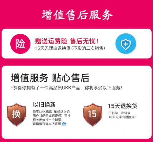 德國UKK廚具優質的售前售后服務也不得不提,德國UKK的鍋具下單15天內在不影響二次銷售的基礎上可以無理由退換貨,壓力快鍋購買兩年還會免費送皮圈,并且商家為每一口鍋都購買了運費險,真正做到讓用戶購物無憂。