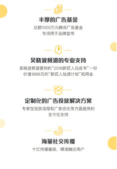 在本次“新匠人新國貨“品牌計劃期間,騰訊廣告營銷服務線與吳曉波頻道將共同投入價值1000萬的騰訊廣告基金,專項用于優秀匠心企業的品牌營銷推廣。入選“新匠人新國貨“品牌計劃的匠心企業將通過擁有海量用戶的騰訊社交平臺,向數百萬新中產消費者展示美好的匠心產品與品牌故事;騰訊的營銷專家也將為匠心企業提供定制化的廣告投放解決方案,幫助他們優化投放流程和廣告內容,講好每一個珍貴的匠心故事;此外,吳曉波頻道也將提供包括“2018新匠人白皮書”、“新匠人加速計劃”抵用金等專業支持,加速新匠人成為企業家,助力新國貨品牌的打造。