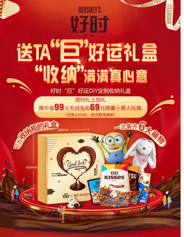 好時定制幸運禮盒。為了吸引消費者,好時與京東跨界合作設計了幸運禮品盒,巨大的禮品盒設計極具特色,標志好時突破傳統的包裝設計,并也因此吸引了新的消費者來嘗試好時的產品。