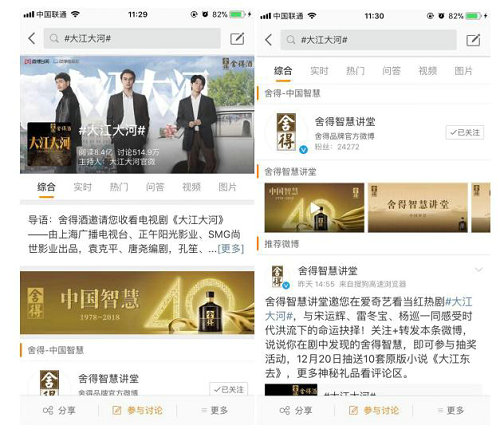 在通過電視劇傳播的主陣地覆蓋用戶之外,舍得還與新浪微博聯合推送#大江大河#微博話題,在社交平臺與用戶形成高頻次的品牌互動,為《舍得智慧講堂》的關注度賦能,讓舍得“中國智慧”的品牌內涵更加深入人心。截止12月12日,在《大江大河》播出僅4集之際,微博話題#大江大河#閱讀已高達10.8億次,討論達553.7萬條。由此可見,舍得發起的這輪品牌營銷攻勢值得期待。
