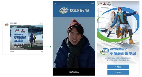 為全面推廣“活力冬奧學院2.0”,12月3日伊利上線了朋友圈廣告。以直白明了的文案“打個飛的去滑雪,別再過個假冬天”,配合現場親臨感十足的全幅式卡片廣告,吸引用戶關注點擊。