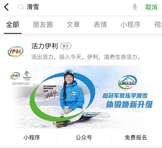 當下正逢雪季,滑雪儼然成了朋友圈的熱門話題。為了收割精準流量,此次伊利除了將自身品牌及活動名稱作為搜一搜的關鍵詞外,還搶占了“滑雪”這一極具時效性的IP熱詞(這也是快消行業在“搜一搜”嘗試的第一個IP類詞),將那些有滑雪計劃或興趣的目標用戶引導至其品牌官方區,繼而了解活力冬奧學院的報名活動。