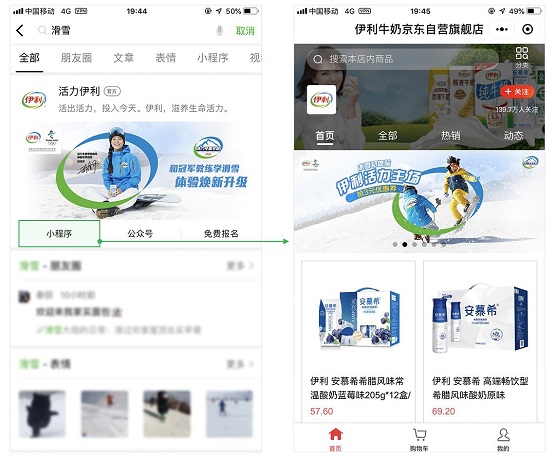 此外,伊利品牌官方區首次打通了京東開普勒小程序。用戶點擊小程序,即可進入伊利京東自營旗艦店購買商品。這對于品牌而言,極大地降低了開發和運營成本,實現了多渠道資源的高效整合。