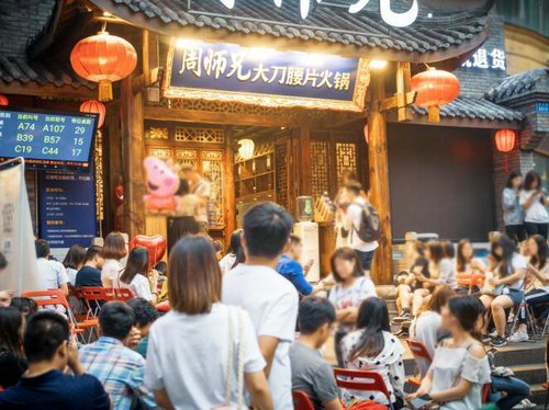 “重慶火鍋排隊王,月排隊超過10000桌”、“重慶本地人喜歡的火鍋”……在激烈的市場競爭中,周師兄開創了“大刀腰片火鍋”概念并引領市場潮流。目前,已有解放碑、南坪步行街、觀音橋(2家)、汽博中心共5家直營店,從不打折卻依然家家爆滿、天天排隊。