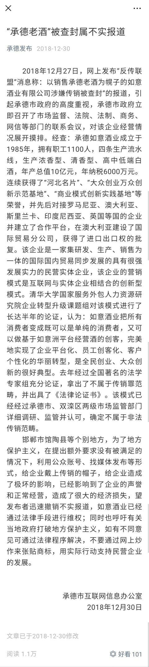 耐人尋味的是,2018年12月30日11:39:51,和合承德網發布了一篇題為《“承德老酒”被查封屬不實報道》的消息,文中稱:“該企業的營銷模式是互聯網與實體企業相結合的創新型模式。清華大學國家服務外包人力資源研究院企業轉型升級課題組對該模式進行了長達半年的論證,認為:如意酒業把所有消費者變成既可以是單純的消費者,又可以做基于如意洲平臺經營酒的創客,完美地實現了企業平臺化、員工創客化、客戶個性化的華麗轉型,是全民創業、大眾創新的很好典型。去年經過全國著名的法學專家組充分論證,拿出了不屬于傳銷罪范疇,并出具了《法律論證書》。該模式已經經過承德市、雙灤區兩級市場監管部門詳細調研、監管并認可,確定不屬于非法傳銷范疇!