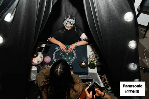 下午6點粉絲入場即場地被暗紫色霓虹燈為主和其它霓虹燈交相輝映所吸引,充滿神秘的占卜氣息烘托了整場氣氛,更有塔羅牌風的吊旗別有風情,契合塔羅牌的屬性。場地入口設有4個神秘的塔羅牌燈光旋轉門,粉絲們從塔羅牌旋轉門選擇進入某一區域,塔羅牌分別設置為女神養成的四要素,通過塔羅牌所代表的松下產品類型,以料理、烘焙、美發、個護四個產品屬性為中心,延展女神養成的四個特質。