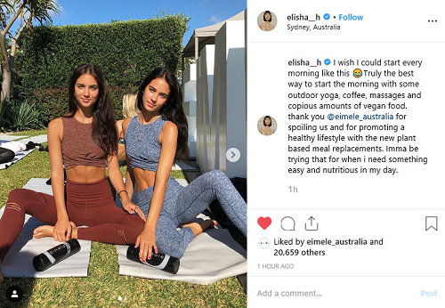 擁有140萬粉絲的澳洲超模Elisha Herbert和她同為超模的網紅妹妹Renee Herbert,表示“Eimele亦餐能夠幫助我們開啟全新生活,體驗一種此前從未體驗過的減脂方式!Eimele亦餐讓我們原來的減脂生活,不再單調、不再乏味。相反的,還多出了幾分激情,多出了幾分期待。”