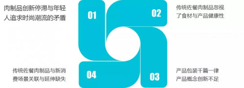第一是傳統佐餐肉制品的創新停滯與年輕人追求時尚潮流的矛盾。佐餐肉制品經歷了快速發展之后,產品缺乏創新,一種口味通全國,產品口感口味同質化,年輕人無感。