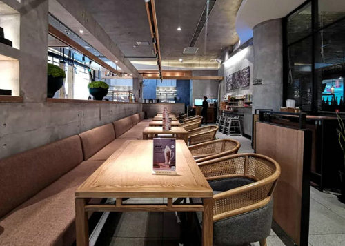 走進位于上海合生匯的門店,茶米茶古樸的裝修風格可以說是很東方,淺色木質帶來一種肅穆感,店內隨處可見的茶藝擺件、復古插畫、中式藤椅,這里的一切都在讓“時光慢下來”。這里既是茶飲店又是餐廳的舒適空間,最終希望給顧客創造一個易親近、安逸、放松、休閑的休憩場所。