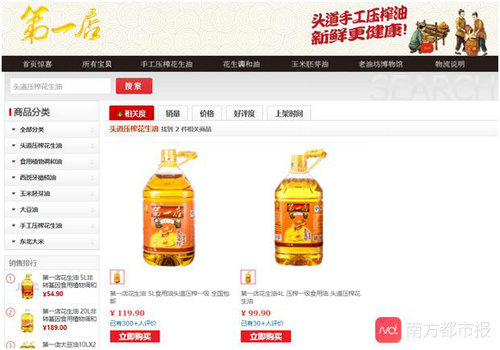 南都記者在京東第一店官方旗艦店搜索發現,仍有兩款不同規格的頭道壓榨花生油在售,天貓第一店官方旗艦店也仍有三款頭道壓榨花生油在售。