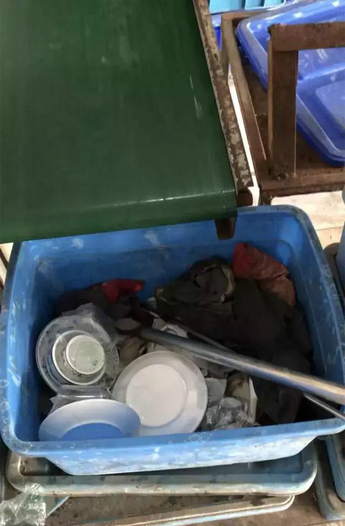 傳送帶下的箱子里散落著來不及裝箱的餐具,里面的臟抹布用來擦抹塑料箱。新京報記者 劉經宇 攝